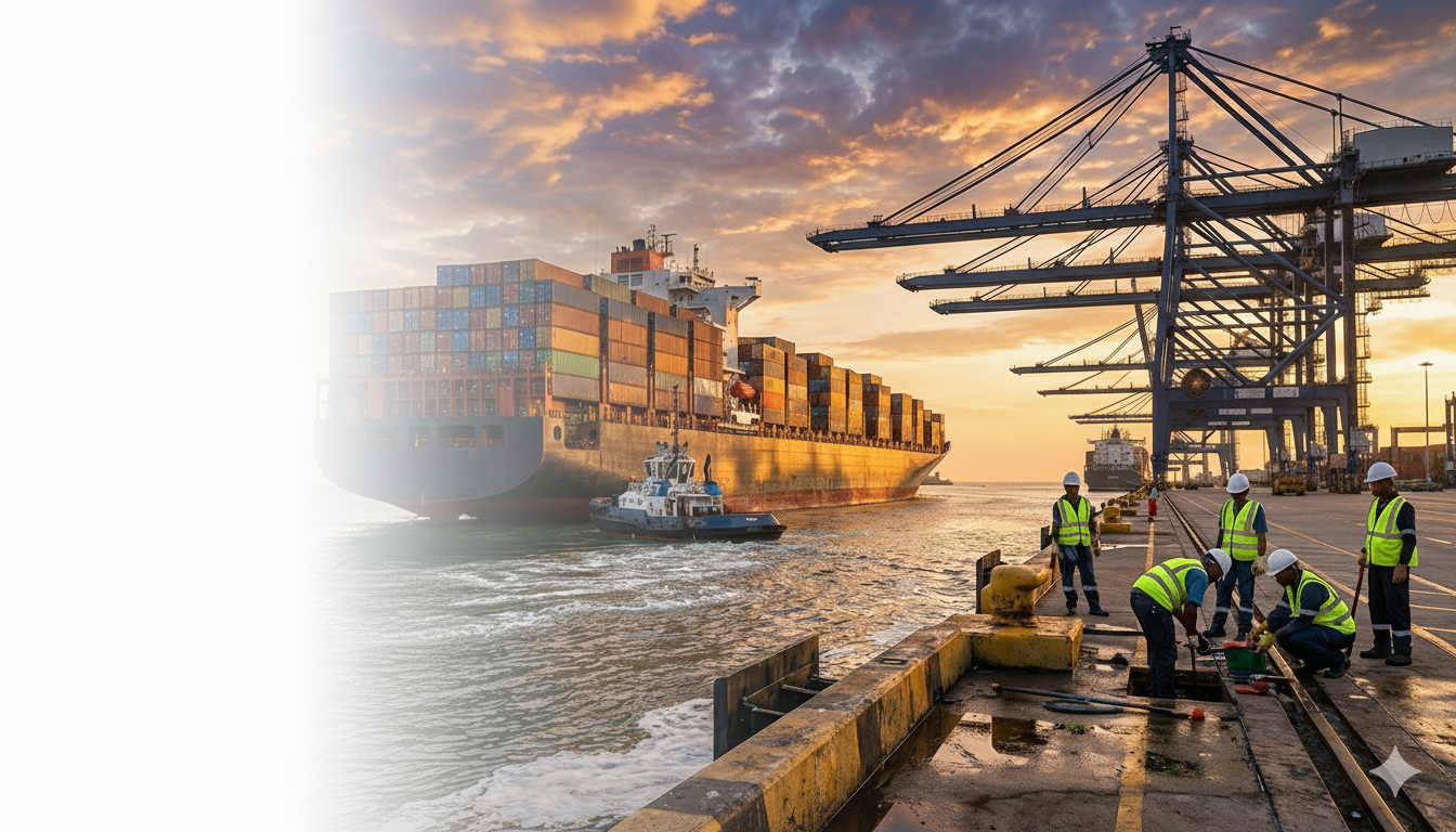 Realizamos limpieza, reparación y conservación de muelles, defensas portuarias, amarres y rieles, asegurando condiciones seguras para operaciones de embarque y desembarque.